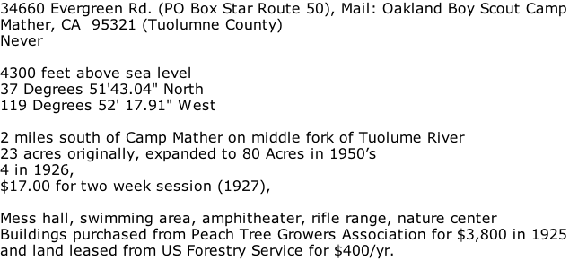 Oakland Area Council Patch (c 1950) San Francisco Bay Area Council History B S A B S A Los Mochos Symbol, Oakland Area Council (1945 - Present) Camp Loomer Symbol, Oakland Area Council (1957 - 1973) TC San Francisco Training Camp symbol, San Francisco Council (1917 - 1924) Camp Moore symbol, San Francisco Council (1938 - 1951) Camp Lilienthal Symbol (Fairfax location), San Francisco Council (1928 - 1973) Camp Royaneh symbol, San Francisco Council (1925 - Present) Camp Lilienthal (Stern Grove location) Symbol, San Francisco Council (1919 - 1925) Boy Scouts of America, San Francisco Bay Area Council • 1001 Davis Street, San Leandro, CA 94577-1514, (510) 577-9000  |  Contact Webmaster Dimond-O (Mather, CA) 1926 - 1979 Address: City: Phone:  Elevation: Latitude: Longitude:  Location: Area: Camp Sites: Camp Fee:  Amenities: Acquisition: Entrance gateway to Dimond-O from Evergreen road Dimond-O Leather Patch (c 1933), Image courtesy of the Adam Lombard Collection History Camps Boy Scouts of America, San Francisco Bay Area Council • 1001 Davis Street, San Leandro, CA 94577-1514, (510) 577-9000