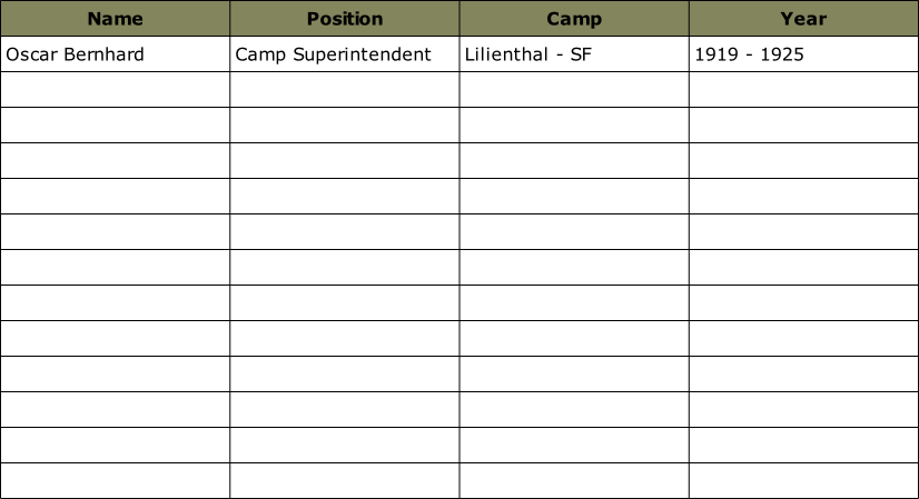 San Francisco Council Patch, (c 1950) San Francisco Bay Area Council History B S A B S A Los Mochos Symbol, Oakland Area Council (1945 - Present) Camp Loomer Symbol, Oakland Area Council (1957 - 1973) TC San Francisco Training Camp symbol, San Francisco Council (1917 - 1924) Camp Moore symbol, San Francisco Council (1938 - 1951) Camp Lilienthal Symbol (Fairfax location), San Francisco Council (1928 - 1973) Camp Royaneh symbol, San Francisco Council (1925 - Present) Camp Lilienthal (Stern Grove location) Symbol, San Francisco Council (1919 - 1925) Boy Scouts of America, San Francisco Bay Area Council • 1001 Davis Street, San Leandro, CA 94577-1514, (510) 577-9000  |  Contact Webmaster Camp Lilienthal Camp Staff / Ranger 1919 - 1925 Pictures