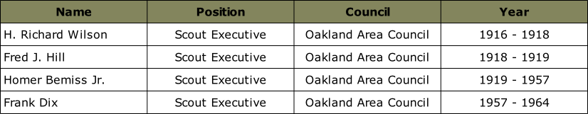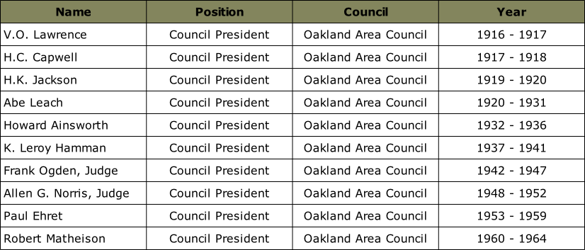 Oakland Area Council Patch (c 1950) San Francisco Bay Area Council History B S A B S A Los Mochos Symbol, Oakland Area Council (1945 - Present) Camp Loomer Symbol, Oakland Area Council (1957 - 1973) TC San Francisco Training Camp symbol, San Francisco Council (1917 - 1924) Camp Moore symbol, San Francisco Council (1938 - 1951) Camp Lilienthal Symbol (Fairfax location), San Francisco Council (1928 - 1973) Camp Royaneh symbol, San Francisco Council (1925 - Present) Camp Lilienthal (Stern Grove location) Symbol, San Francisco Council (1919 - 1925) Boy Scouts of America, San Francisco Bay Area Council • 1001 Davis Street, San Leandro, CA 94577-1514, (510) 577-9000  |  Contact Webmaster Oakland Area Council Council Executives / Presidents 1916 - 1964 Council Offices Camps Council Board Uniform patch