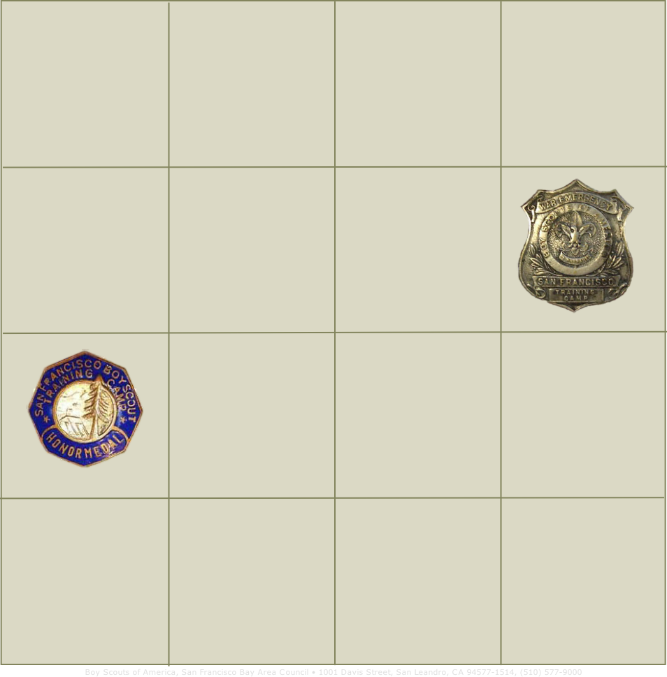 San Francisco Council Patch, (c 1950) San Francisco Bay Area Council History B S A B S A Los Mochos Symbol, Oakland Area Council (1945 - Present) Camp Loomer Symbol, Oakland Area Council (1957 - 1973) TC San Francisco Training Camp symbol, San Francisco Council (1917 - 1924) Camp Moore symbol, San Francisco Council (1938 - 1951) Camp Lilienthal Symbol (Fairfax location), San Francisco Council (1928 - 1973) Camp Royaneh symbol, San Francisco Council (1925 - Present) Camp Lilienthal (Stern Grove location) Symbol, San Francisco Council (1919 - 1925) Boy Scouts of America, San Francisco Bay Area Council • 1001 Davis Street, San Leandro, CA 94577-1514, (510) 577-9000  |  Contact Webmaster San Francisco Training Camp (Olema) Patches / Memorabilia 1917 - 1918 Olema Training Camp Training Camp Pin, c 1918, Image Courtesy of the Adam Lombard Camp Collection Training Camp Pin, c 1918 Training Camp Pin, c 1918, Image Courtesy of the Adam Lombard Camp Collection Training Camp Pin, c 1918, Image Courtesy of the Adam Lombard Camp Collection Training Camp Pin, c 1918, Image Courtesy of the Adam Lombard Camp Collection Training Camp Pin, c 1918, Image Courtesy of the Adam Lombard Camp Collection 1918 Training Camp Award 1918 Training Camp Award 1918 Training Camp Award 1918 Training Camp Award 1918 Training Camp Award 1918 Training Camp Award 1918 Training Camp Award San Francisco Training Camp, War Emergency Badge (c 1918)